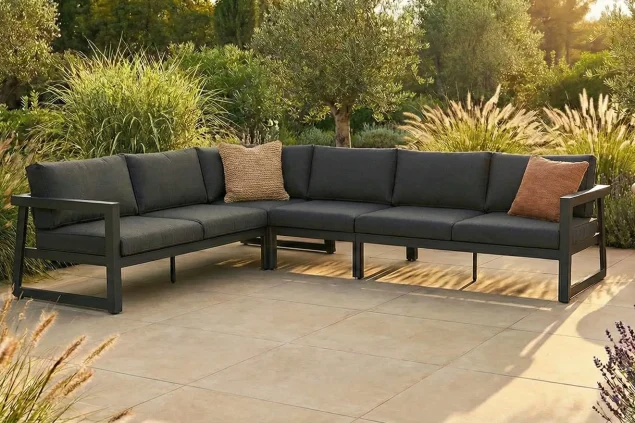 Suns Nardo Lounge-Set XL Camel Sand-Gestell mit Beachy Bouclé-Kissen und Teakholzplatten 6.200,- 5.499,-