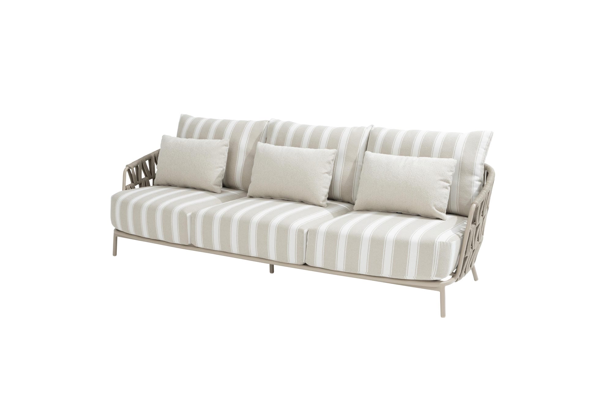 Das Beverly Lounge-Sofa Latte hat ein besonders luxuriöses Design. Sehr großzügige Kissen werden mit einem wunderschön gestalteten Rahmen mit Seilgeflecht in einem einzigartigen und trendigen Muster kombiniert. Die riesigen Sitzkissen fallen sofort ins Auge und sorgen für das ultimative Lounge-Feeling, insbesondere in Kombination mit den passenden Rücken- und Lendenkissen. Die Kissen haben einen weichen, wetterfesten Olefin-Bezug mit Dacron-Füllung.