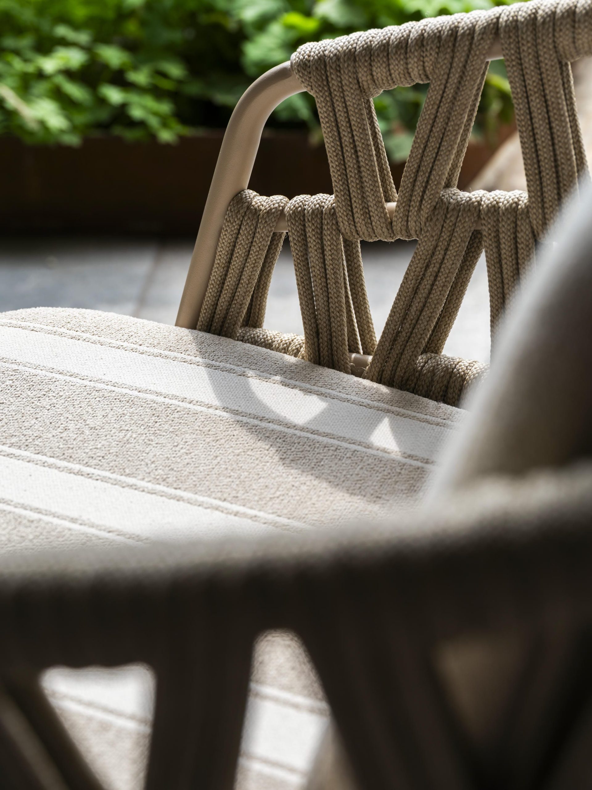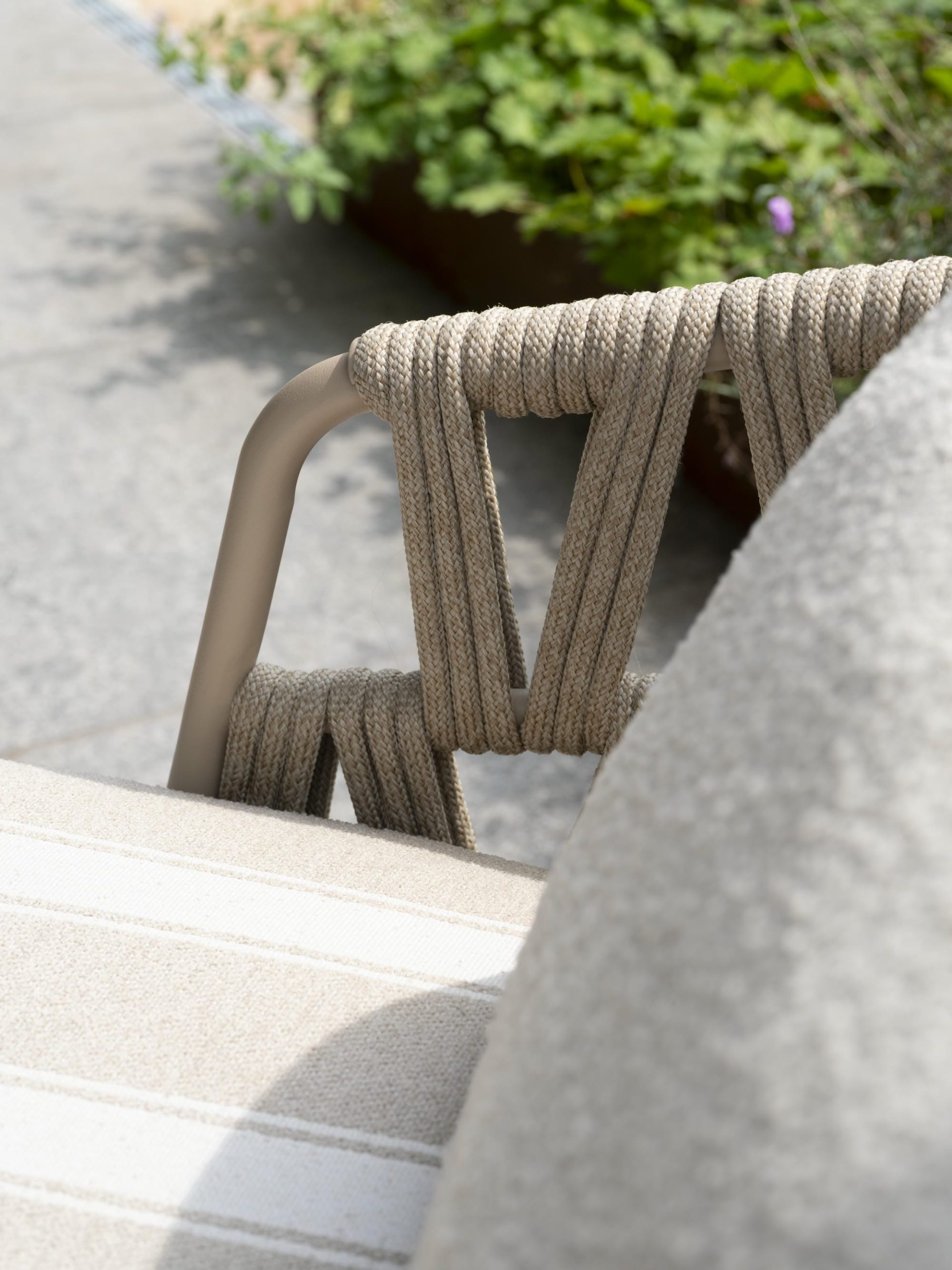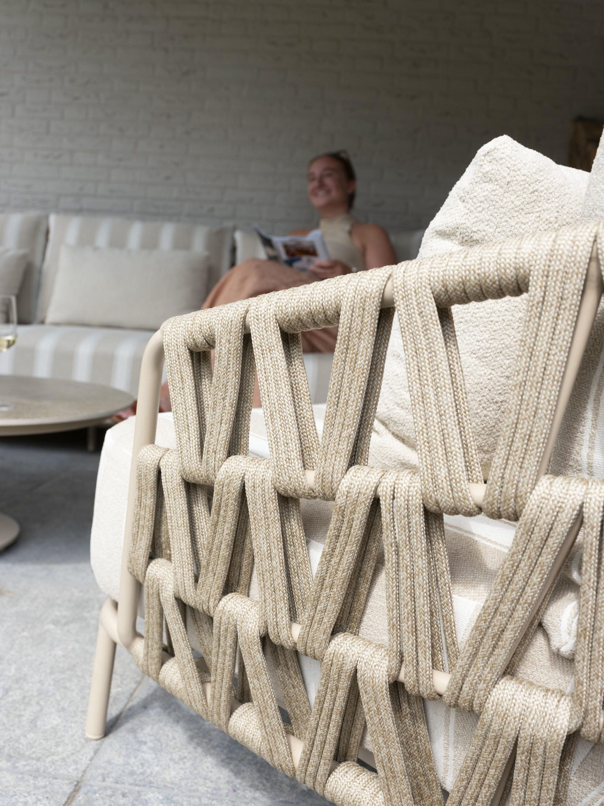Der Beverly Lounge-Sessel Latte hat ein besonders luxuriöses Design. Sehr großzügige Kissen werden mit einem wunderschön geformten Rahmen mit Seilgeflecht in einem einzigartigen und trendigen Muster kombiniert. Das riesige Sitzkissen fällt sofort ins Auge und sorgt für das ultimative Lounge-Feeling, insbesondere in Kombination mit dem passenden Rücken- und Lendenkissen. Die Kissen haben einen weichen, wetterfesten Olefin-Bezug mit Dacron-Füllung.