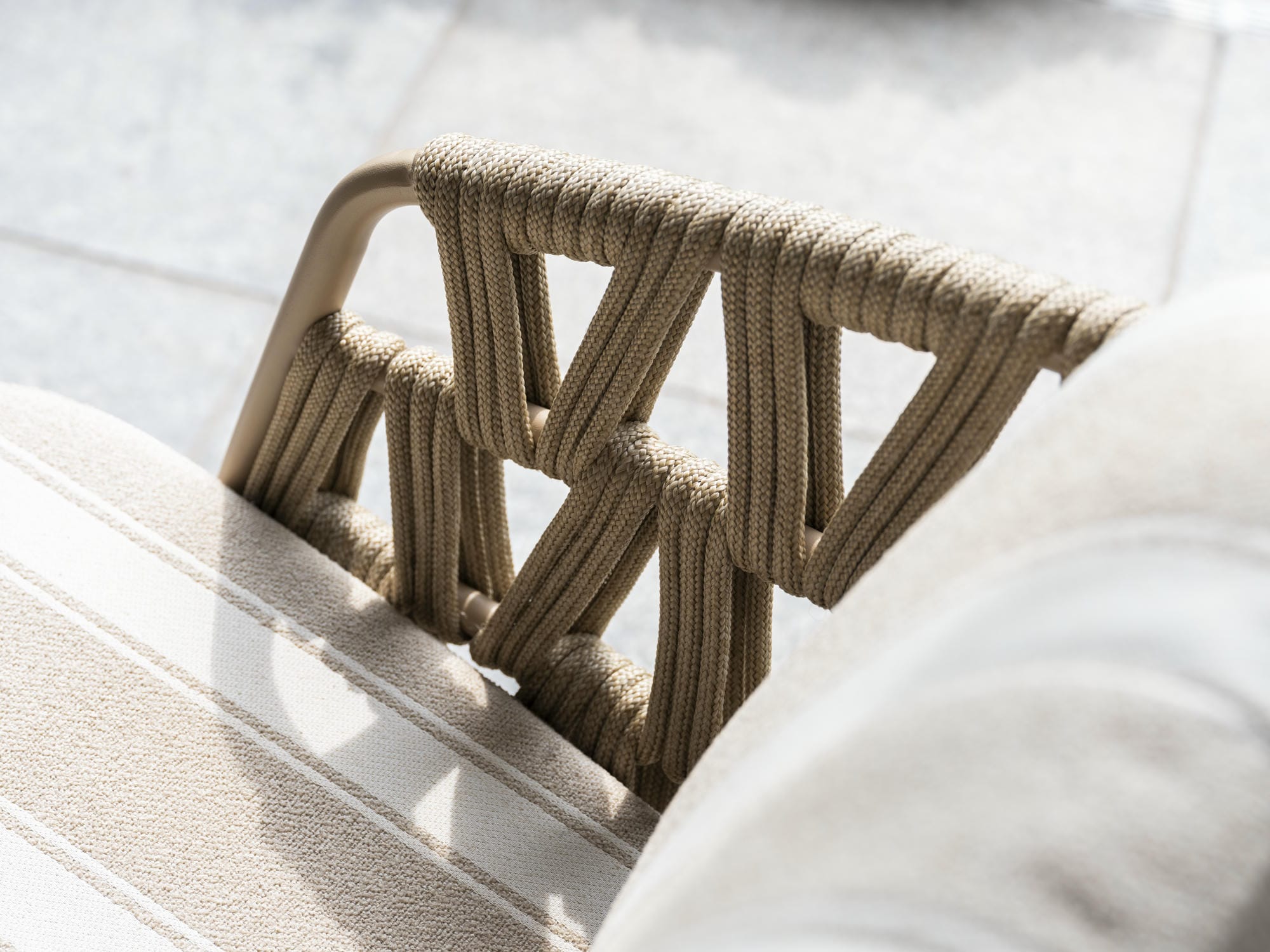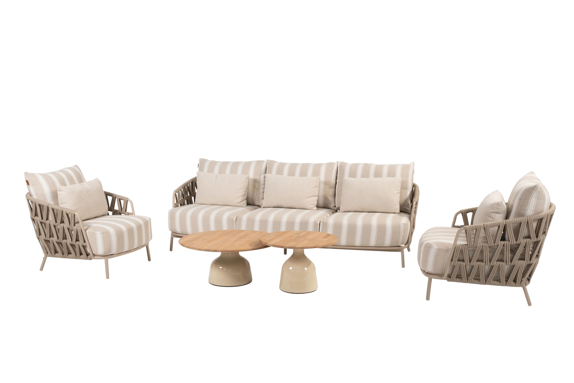 Das Beverly Lounge-Set Latte hat ein besonders luxuriöses Design. Sehr großzügige Kissen werden mit einem wunderschön gestalteten Rahmen mit Seilgeflecht in einem einzigartigen und trendigen Muster kombiniert. Die riesigen Sitzkissen fallen sofort ins Auge und sorgen für das ultimative Lounge-Feeling, insbesondere in Kombination mit den dazugehörigen Rücken- und Lendenkissen. Die Kissen haben einen weichen, wetterfesten Olefin-Bezug mit Dacron-Füllung.