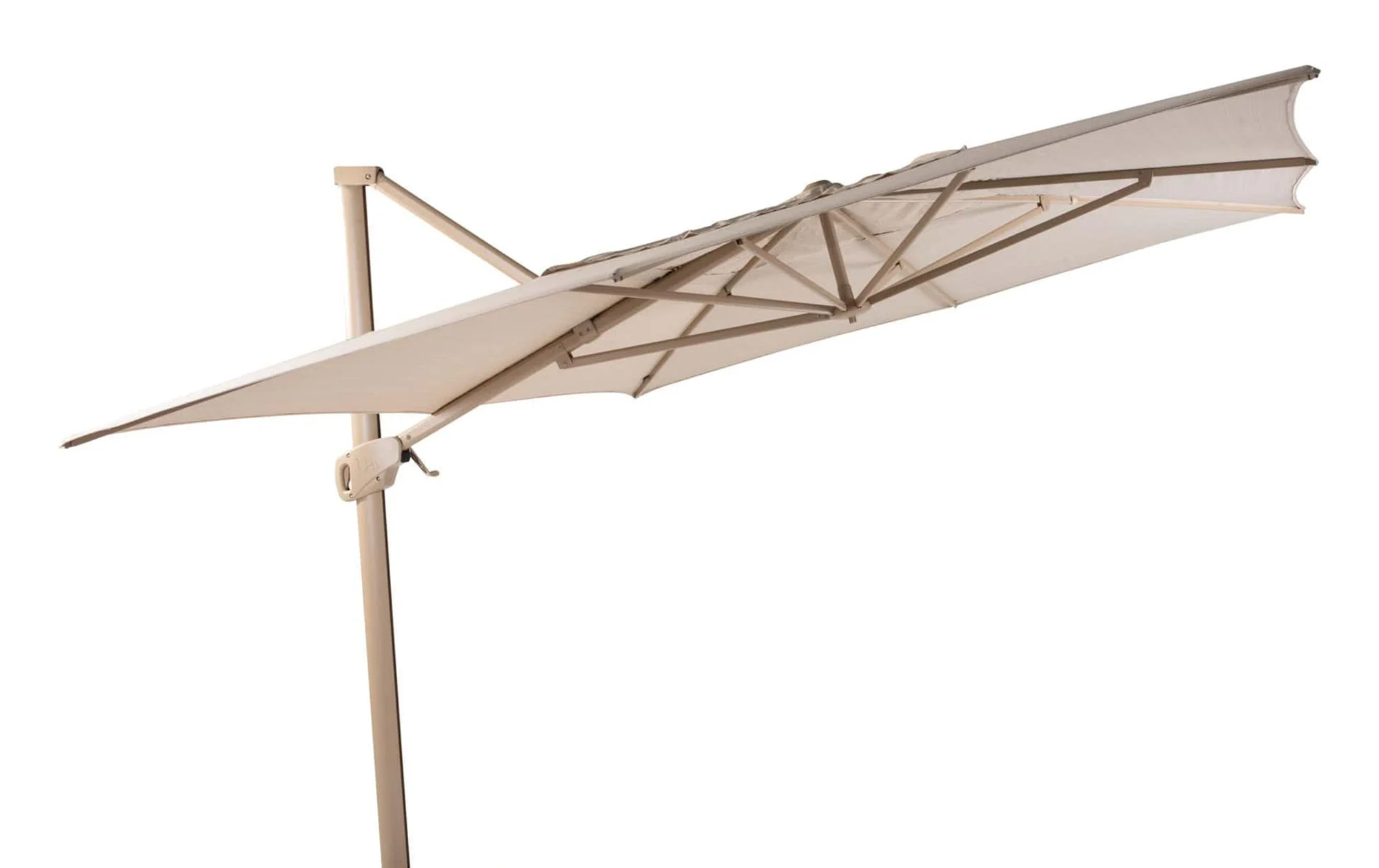 Der Sonnenschirm hat ein stabiles Aluminiumgestell in der Farbe Latte und das sandfarbene Tuch ist aus dem hochwertigen Solefin-Gewebe gefertigt. Der Stoff hat den höchstmöglichen UPF (50+ Utra violet Protection Factor) und bietet somit optimalen Sonnenschutz. Der Stoff ist absolut wetterfest und sehr farbecht. So werden Sie lange Freude an diesem Hacienda-Sonnenschirm haben.