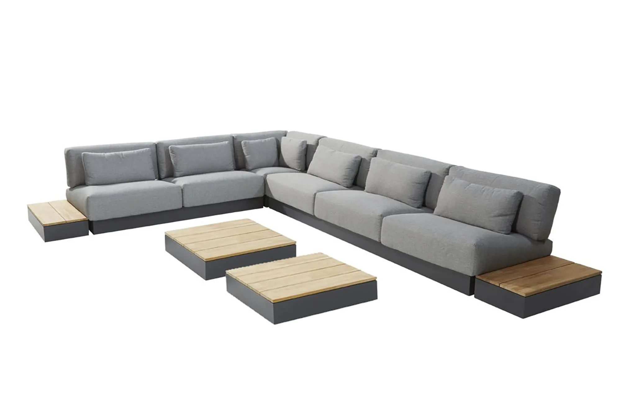Bestellen Sie jetzt mit einem extra hohen Rabatt: das 4 Seasons Outdoor Ibiza Plattform Lounge Set XL mit Ecktisch. Dieses luxuriöse Set wird Ihrem Garten oder Ihrer Terrasse eine wahre Metamorphose verleihen. Das Ibiza-Sofa ist ein echter Low-Lounger. Die niedrige Sitzhöhe ermöglicht es Ihnen, sich zu entspannen und mit Ihrer Familie oder Freunden zu genießen. Das Sofa bietet einen noch nie dagewesenen Komfort, auch dank der zusätzlichen Kissen, die die Rückenlehne stützen. Die Kissen sind mit Olefin gepolstert, so dass Sie von allen Eigenschaften dieses Stoffes profitieren können. Olefin ist wasser- und schmutzabweisend, schimmelresistent, farbecht und fühlt sich sehr weich an.