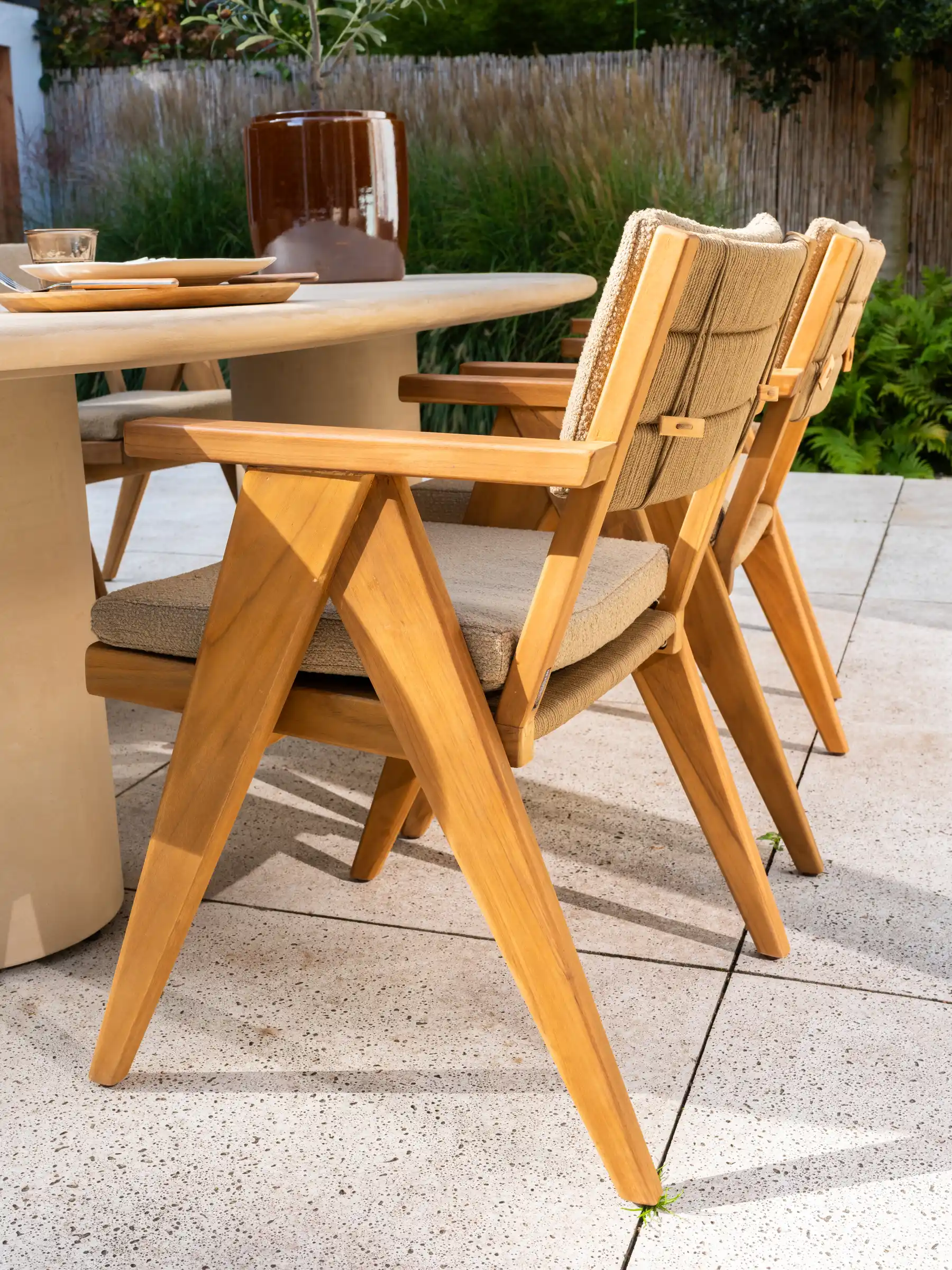 Der Mats Gartenstuhl von 4 Seasons Outdoor verbindet modernes Design mit ultimativem Sitzkomfort. Der Mats Stuhl hat einen hochwertigen Teakholzrahmen und strahlt damit Qualität und Langlebigkeit aus. Raffinierte Seilgeflechte sorgen für einen einzigartigen Look des Stuhls und zwei dicke, wetterfeste Kissen garantieren besonders angenehmen Sitzkomfort.