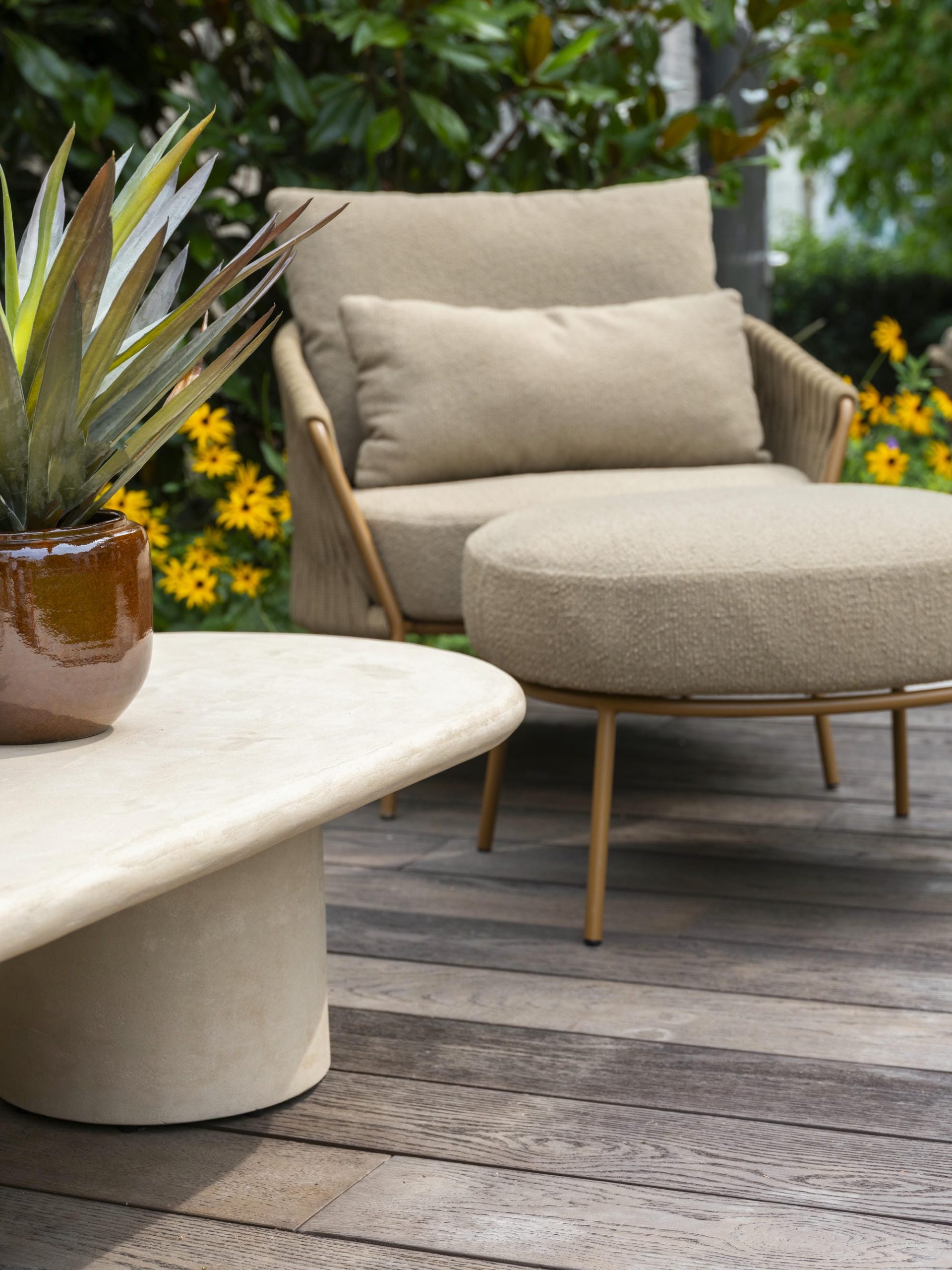 Das Molina Lounge-Set von 4 Seasons Outdoor ist mehr als nur luxuriös. Das Set ist ein echter Blickfang: Das Sofa und die Stühle sind mit wunderschönem, breitem Seilgeflecht und bernsteinfarbenen Edelstahlrahmen ausgestattet. Das Set bietet herrlichen Sitzkomfort: Die wetterfesten Kissen mit weichem Bouclé-Stoff erinnern eher an Ihr Wohnzimmer als an ein Allwetter-Lounge-Set, das das ganze Jahr über im Freien stehen bleiben kann.