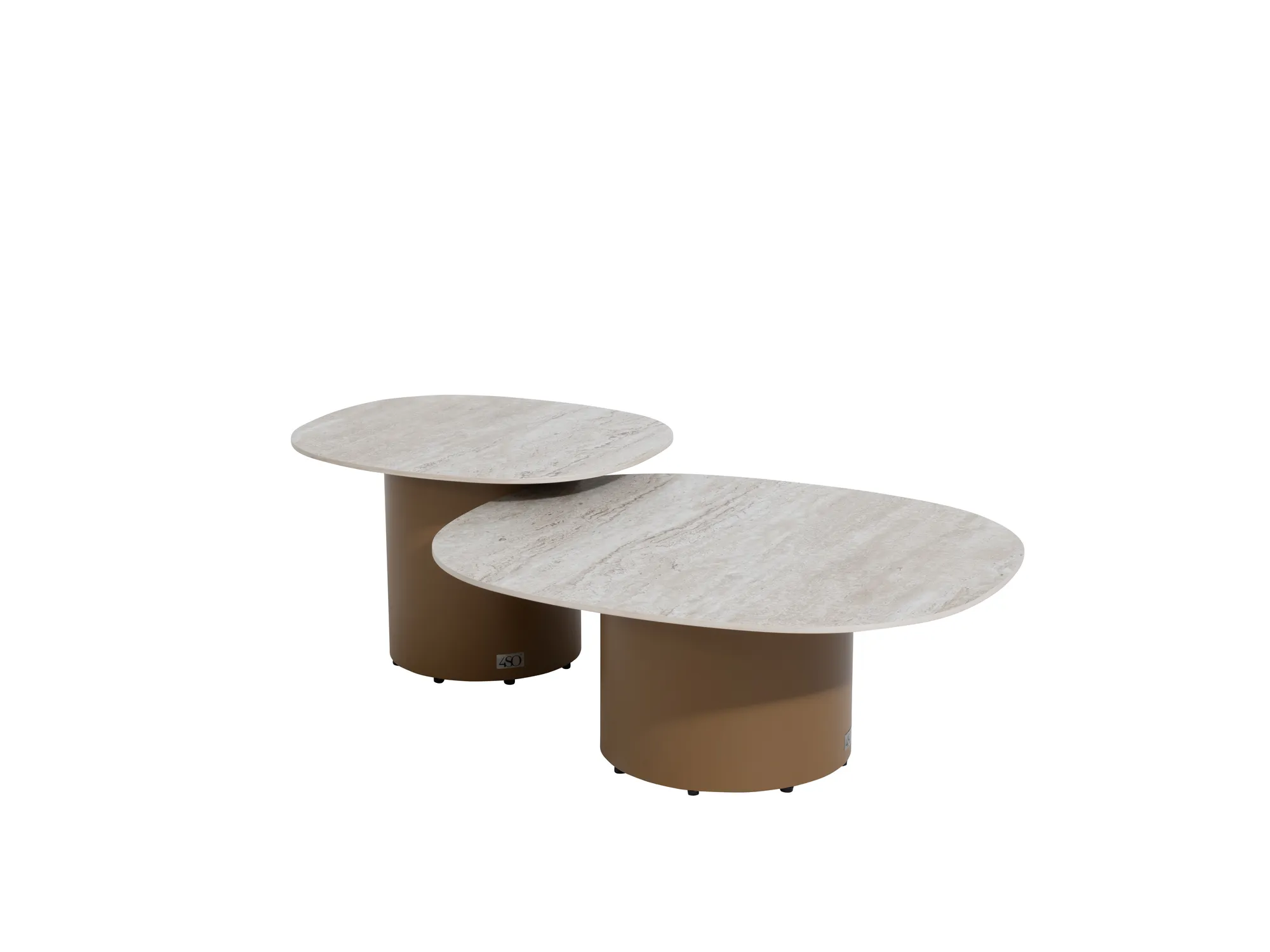 Die passenden Sofie-Loungetische von 4 Seasons Outdoor haben ein Aluminiumgestell mit bernsteinfarbener Pulverbeschichtung und sandfarbene Keramikplatten in den Größen 50 x 60 und 70 x 80 cm.