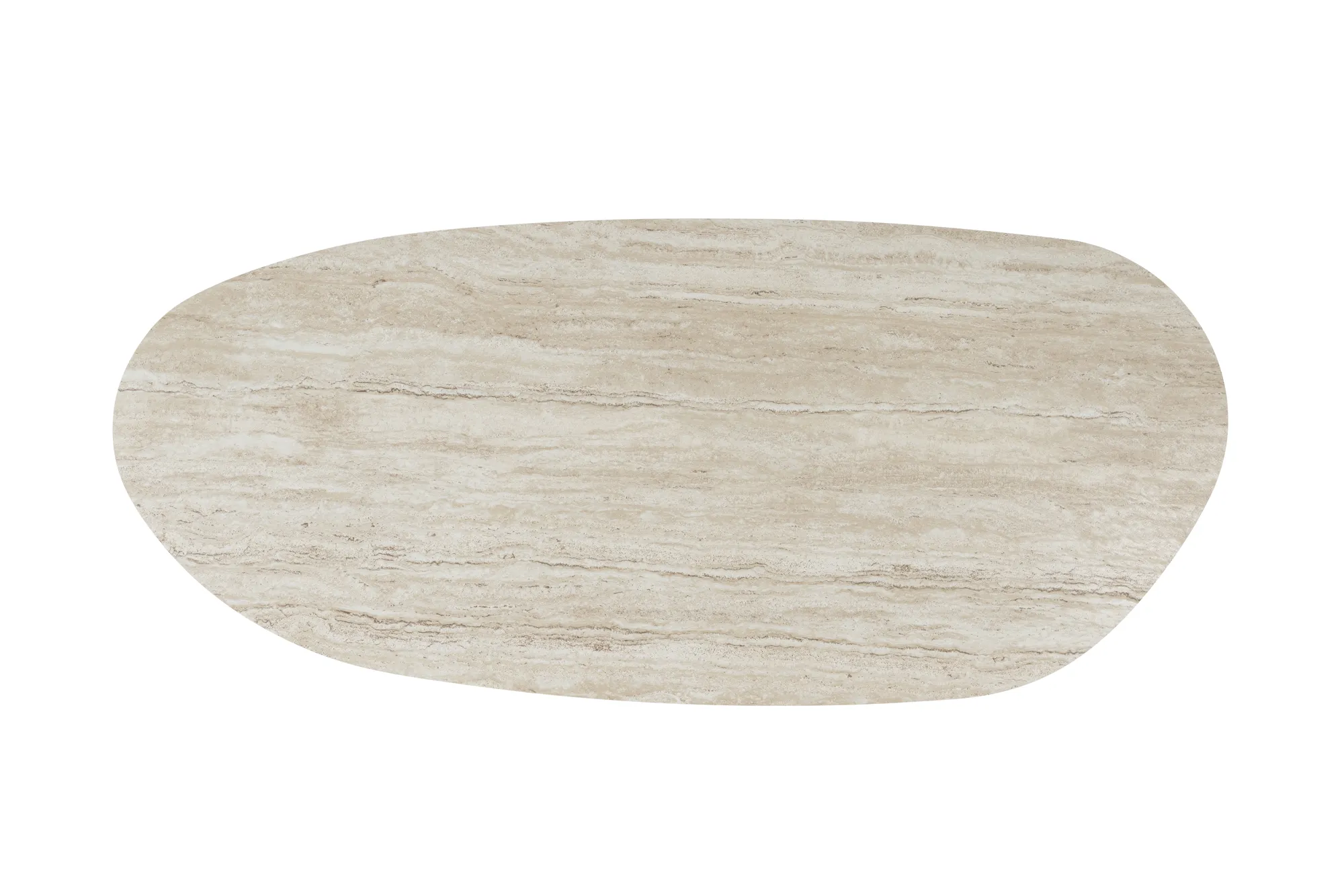 Der passende Estate-Tisch von Taste by 4 Seasons hat ein stabiles Untergestell, das aus drei dicken runden Aluminiumbeinen mit Latte-Pulverbeschichtung besteht. Die mangoförmige Keramikplatte mit den Maßen 240 x 105 cm (an der breitesten Stelle) verleiht dem Tisch ein einzigartiges Aussehen. Die sandfarbene Platte hat schöne Konturen und passt perfekt zu den Puccini-Stühlen.
