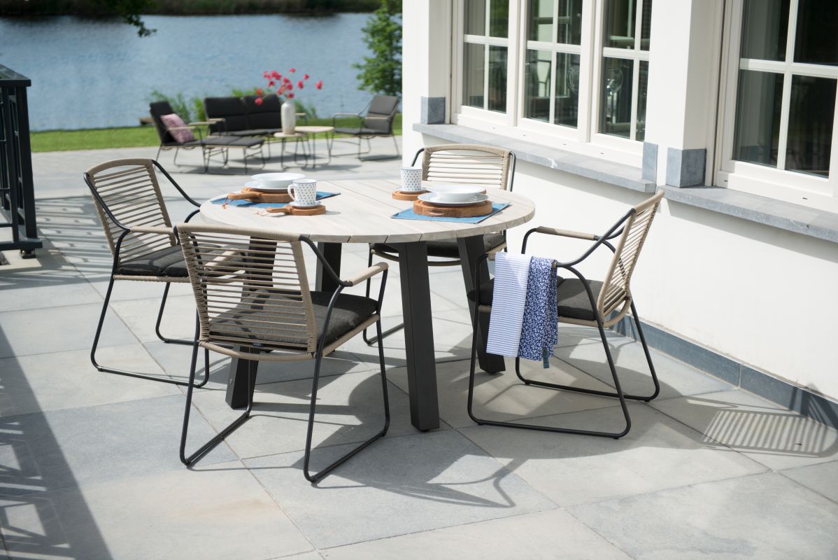 Der Scandic-Gartenstuhl von 4 Seasons Outdoor ist ein echter Blickfang und bietet angenehmen Sitzkomfort. Der Rahmen besteht aus Edelstahl und ist anthrazitfarben beschichtet. Um den Rahmen ist auf schöne Weise Seilgeflecht gewebt, wodurch der Stuhl eine warme Ausstrahlung erhält, auch dank der schönen taupefarbenen Farbe des Seils.