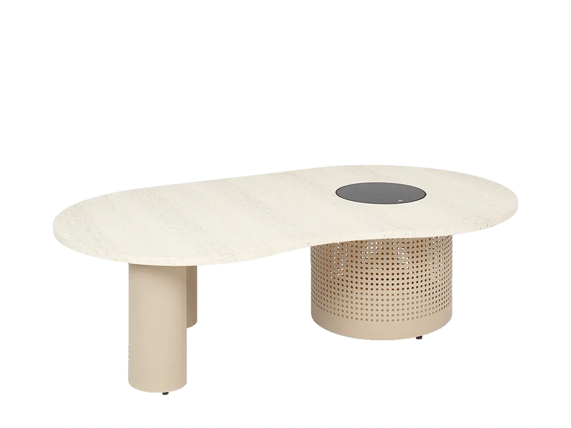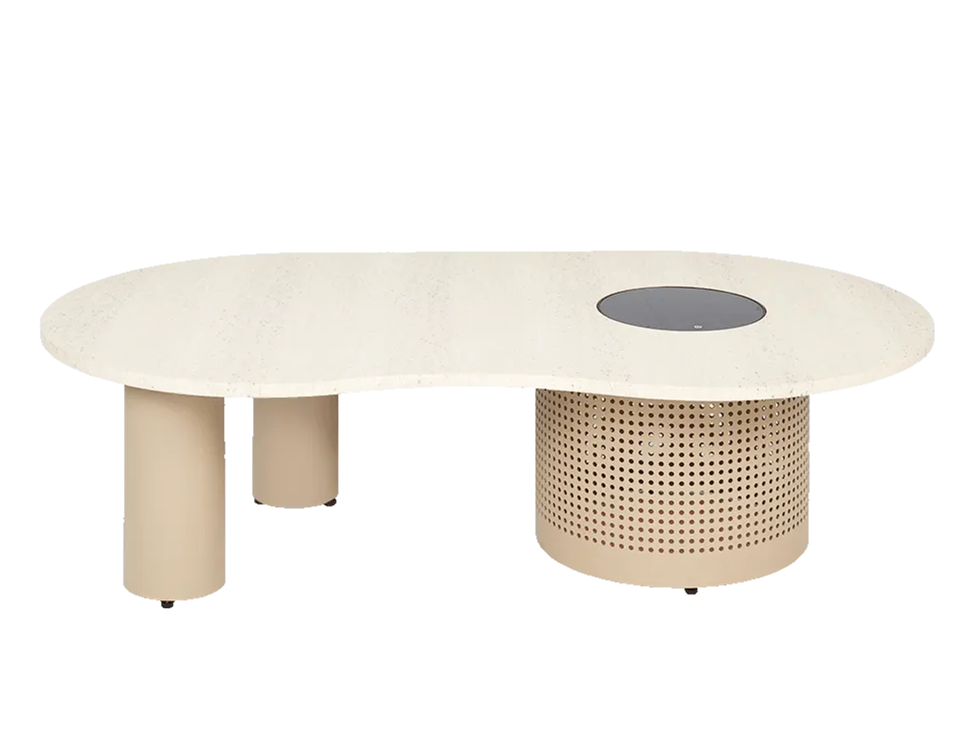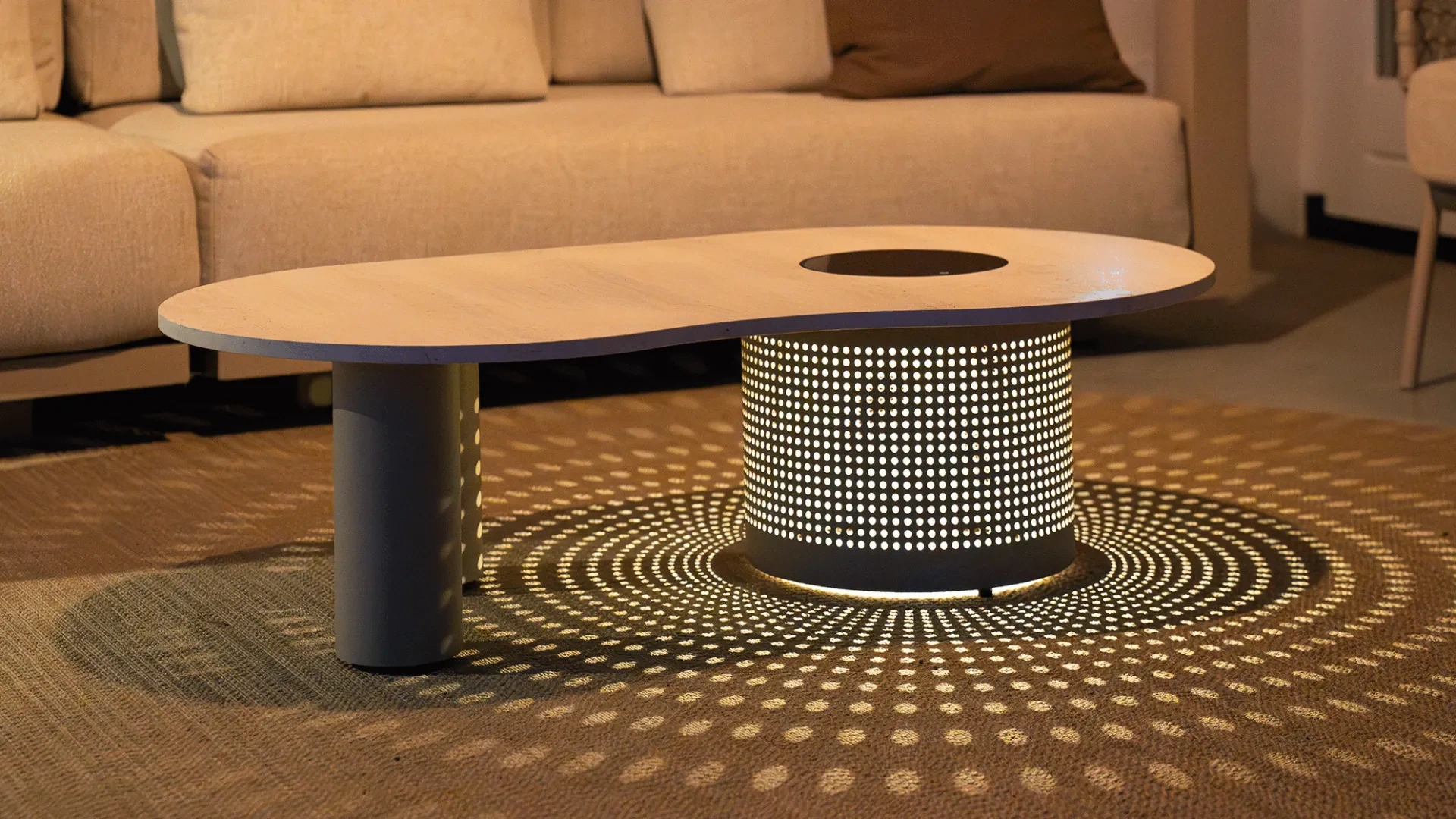 Verbinden Sie Stil und Atmosphäre mit dem Cosinova Lounge-Tisch in Sandbeige: ein eleganter niedriger Tisch mit integrierter Solarbeleuchtung. Der Cosinova-Tisch hat eine organisch geformte Tischplatte in Marmoroptik und Aussparungen im großen runden Rahmen. Zusammen mit der integrierten solarbetriebenen LED-Beleuchtung entsteht ein wunderschönes Lichtmuster auf dem Boden, sowohl im Innen- als auch im Außenbereich.