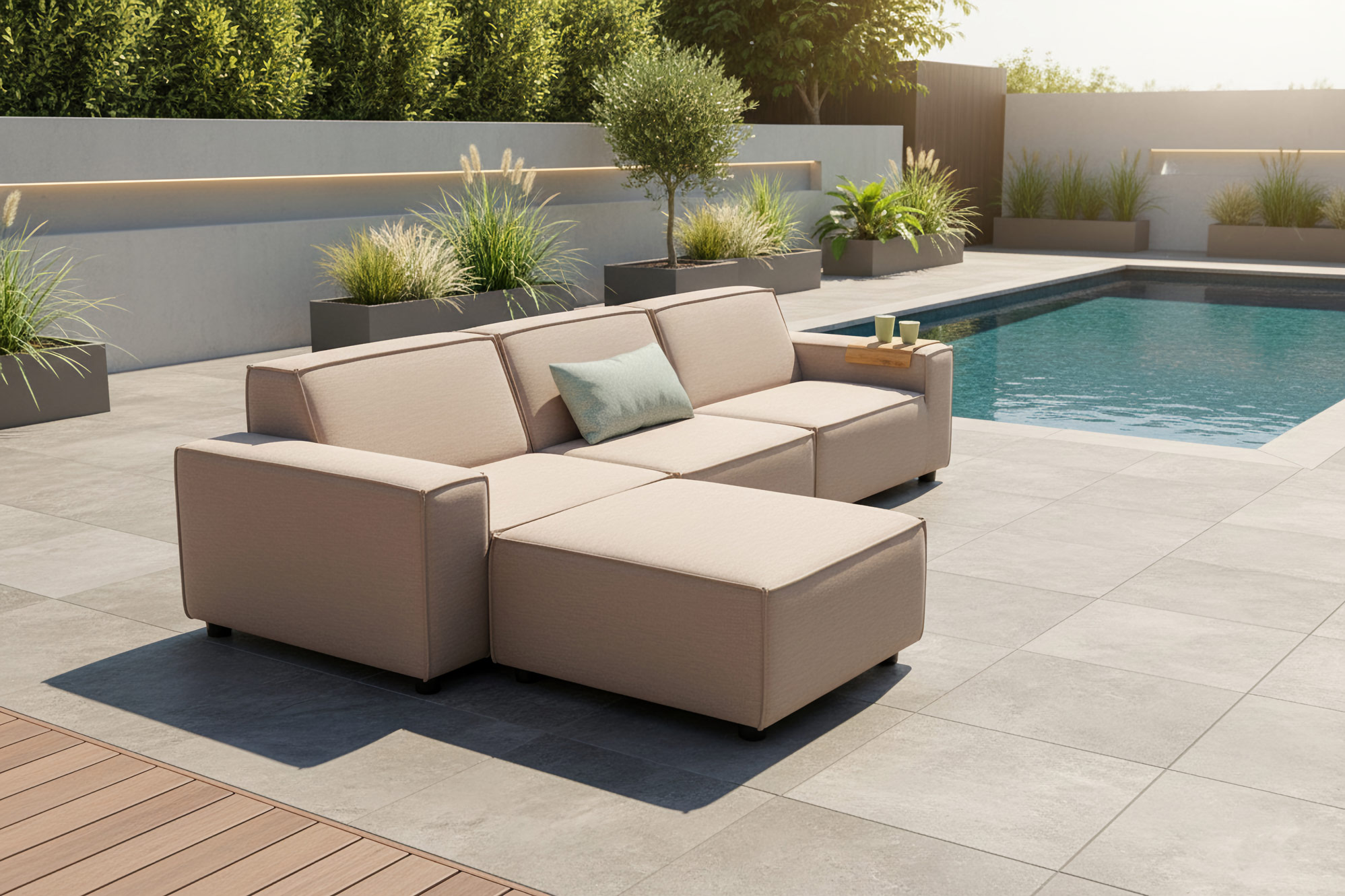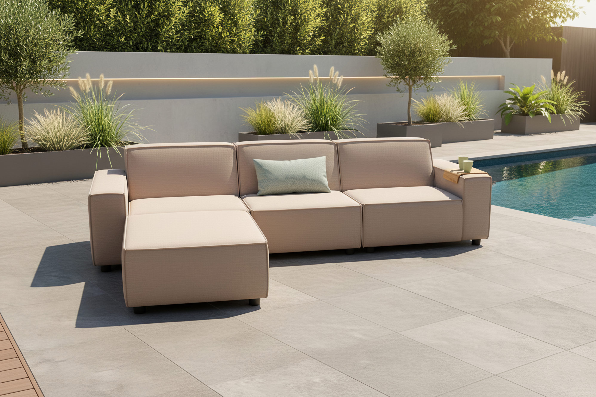 Die Flow Cube Chaise ist eines unserer beliebtesten Modelle. Mit seinen extradicken Kissen bietet das Sofa einen fantastischen Sitzkomfort. Die Sunbrella-Polsterung fühlt sich wunderbar weich an und ist wasser- und schmutzabweisend, farbecht und pflegeleicht. Da die Kissen mit Quick Dry Foam gefüllt sind, wird das Regenwasser in den Kissen schnell abgeleitet. Nach dem Duschen ist das Sofa in der Sonne im Handumdrehen wieder trocken.