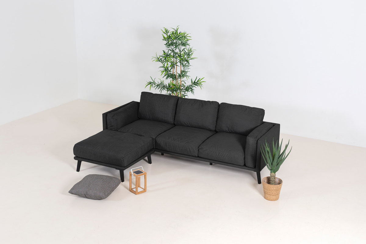 Das trendige Chaisesofa ist mit dem besten derzeit erhältlichen Outdoor-Textil gepolstert: Sunbrella. Die Polsterung fühlt sich nicht nur wunderbar weich an, sondern ist auch wasser- und schmutzabweisend, farbecht und leicht zu reinigen.