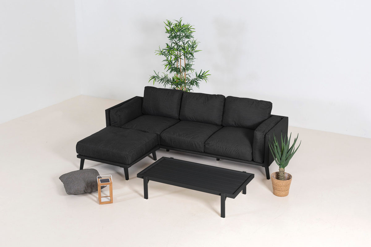 Das Chaisesofa (3-Sitzer-Sofa + Hocker) ist auch mit einem Flow Sublime Couchtisch aus pulverbeschichtetem Aluminium erhältlich. Treffen Sie unten Ihre Wahl.