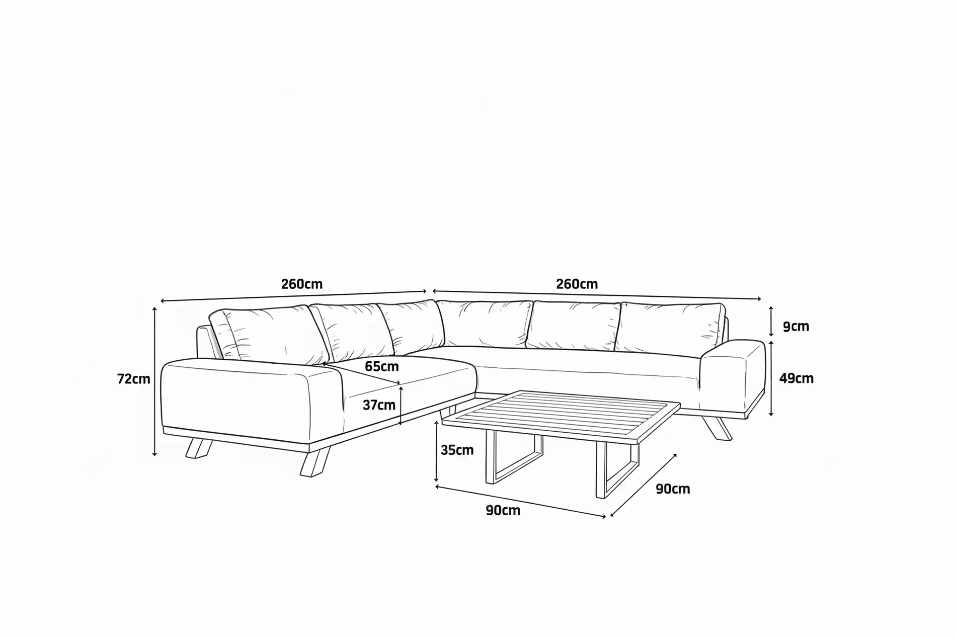 • mit einem Aluminium-Couchtisch Flow Emerald mit einer Platte von 90 x 90 cm