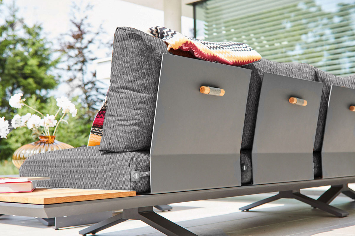 Die gemütlichen Kissen bieten optimalen Sitzkomfort und sind mit Sunproof-Stoff gepolstert. Dieser hochwertige Oberstoff ist wasserabweisend, witterungsbeständig und leicht zu reinigen. Das Sofa ist somit absolut wetterfest und kann das ganze Jahr über draußen stehen bleiben.