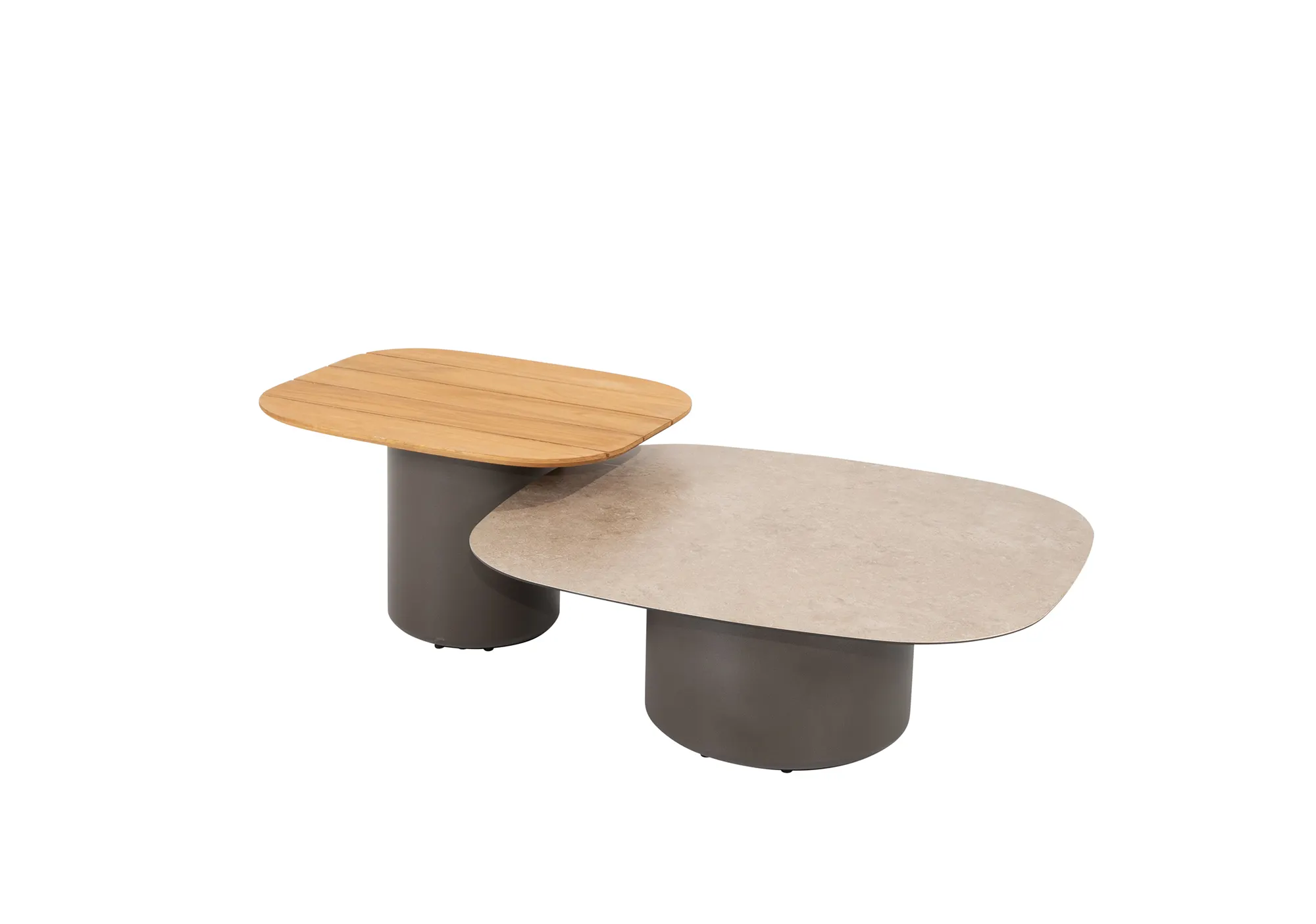 Lernen Sie das Set Demi Couchtische terre von Taste by 4 Seasons kennen. Die Tische haben ein pulverbeschichtetes, terrefarbenes Gestell und kombinieren Tischplatten aus Keramik und Teakholz für einen luxuriösen und natürlichen Look.