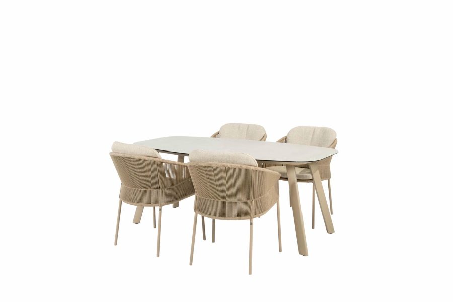 Das Florence-Gartenset Latte von Taste by 4 Seasons mit Prado-Tisch bietet ultimativen Komfort in einem stilvollen Design. Die Florence-Stühle haben leichte und stabile Aluminiumgestelle mit einer Latte-Pulverbeschichtung. Für einen zeitgemäßen Look sind die Stühle wunderschön mit taupefarbenem Seilgeflecht veredelt. Dicke Kissen mit luxuriösem Olefin-Bezug garantieren höchsten Sitzkomfort.