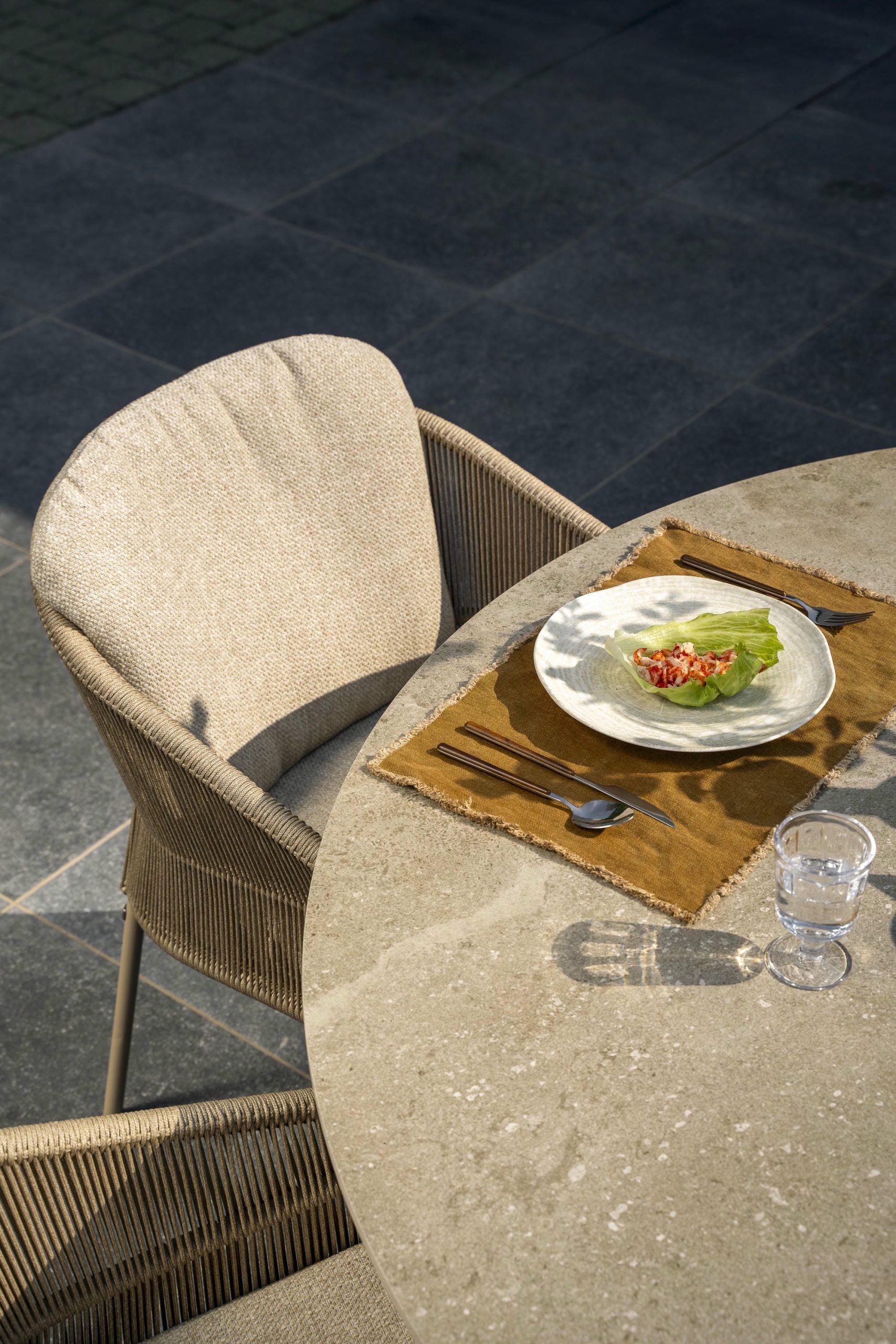 | Material | Kissen mit Olefin-Bezug, Rope, Tischplatte aus Keramik, Aluminiumrahmen (Stühle), Edelstahl-Rahmen (Tisch) |