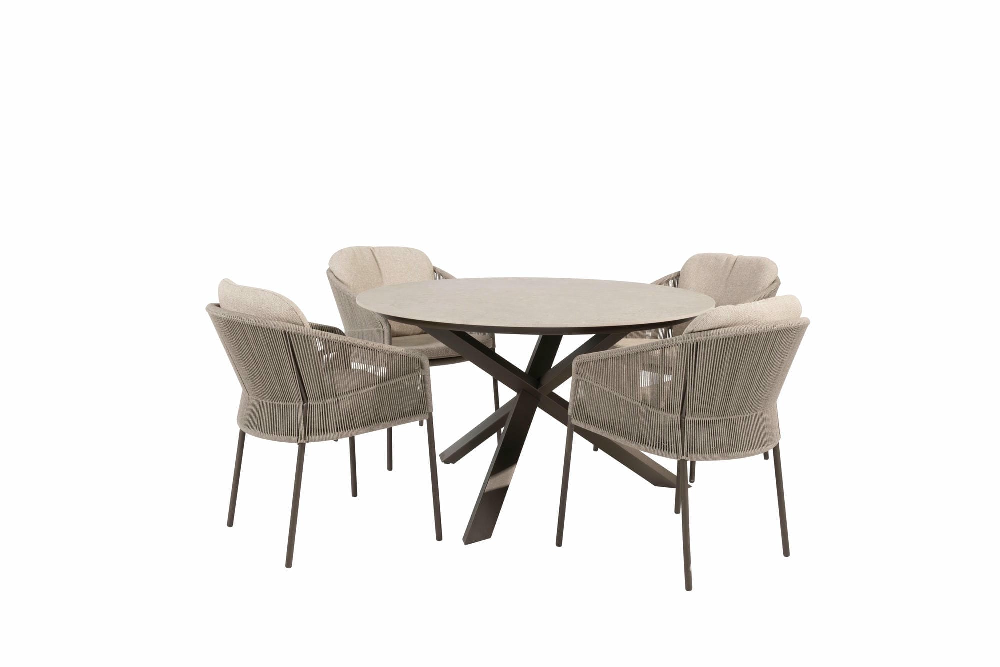 Der passende Prado-Gartentisch von Taste by 4 Seasons hat ein gekreuztes Edelstahlgestell mit einer Terre-Pulverbeschichtung und eine runde Keramikplatte mit einem Durchmesser von 130 cm. Dieser Tisch ist besonders robust und die raffinierten Details der sandfarbenen Keramikplatte verleihen ihm ein besonderes Aussehen.