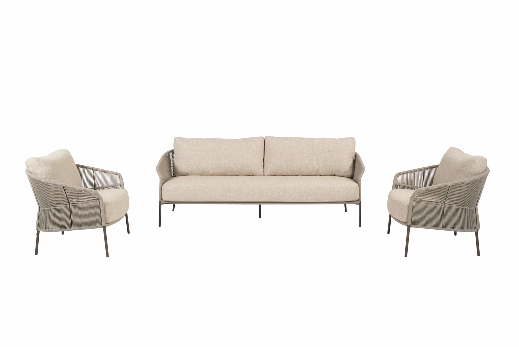 Das Florence Lounge-Set Terre von Taste by 4 Seasons bietet ultimativen Lounge-Komfort in einem stilvollen Design. Die Lounge-Möbel haben leichte und stabile Aluminiumrahmen mit Terre-Pulverbeschichtung. Für einen zeitgemäßen Look sind die Rahmen wunderschön mit Seilgeflecht veredelt. Dicke Kissen mit luxuriösem Olefin-Bezug garantieren herrlichen Lounge-Komfort.