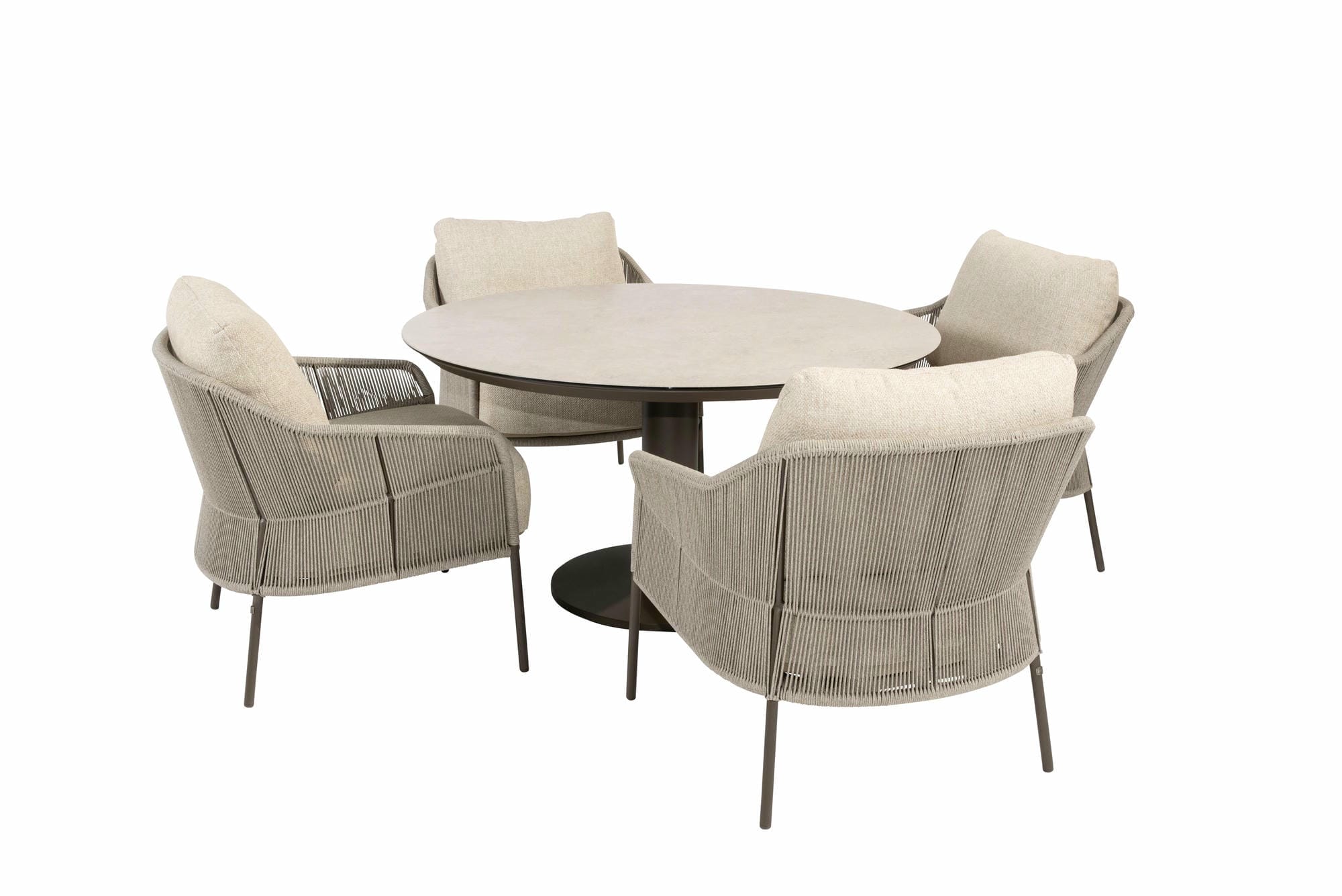 Das Taste by 4 Seasons Florence Low Dining Gartenset Terre mit Sarah Tisch bietet ultimativen Komfort in einem stilvollen Design. Die Florence Low Dining Stühle haben leichte und stabile Aluminiumgestelle mit einer Terre-Pulverbeschichtung. Für einen zeitgemäßen Look sind die Stühle wunderschön mit Seilgeflecht veredelt. Dicke Kissen mit luxuriösem Olefin-Bezug garantieren höchsten Sitzkomfort für dieses Florence Set.