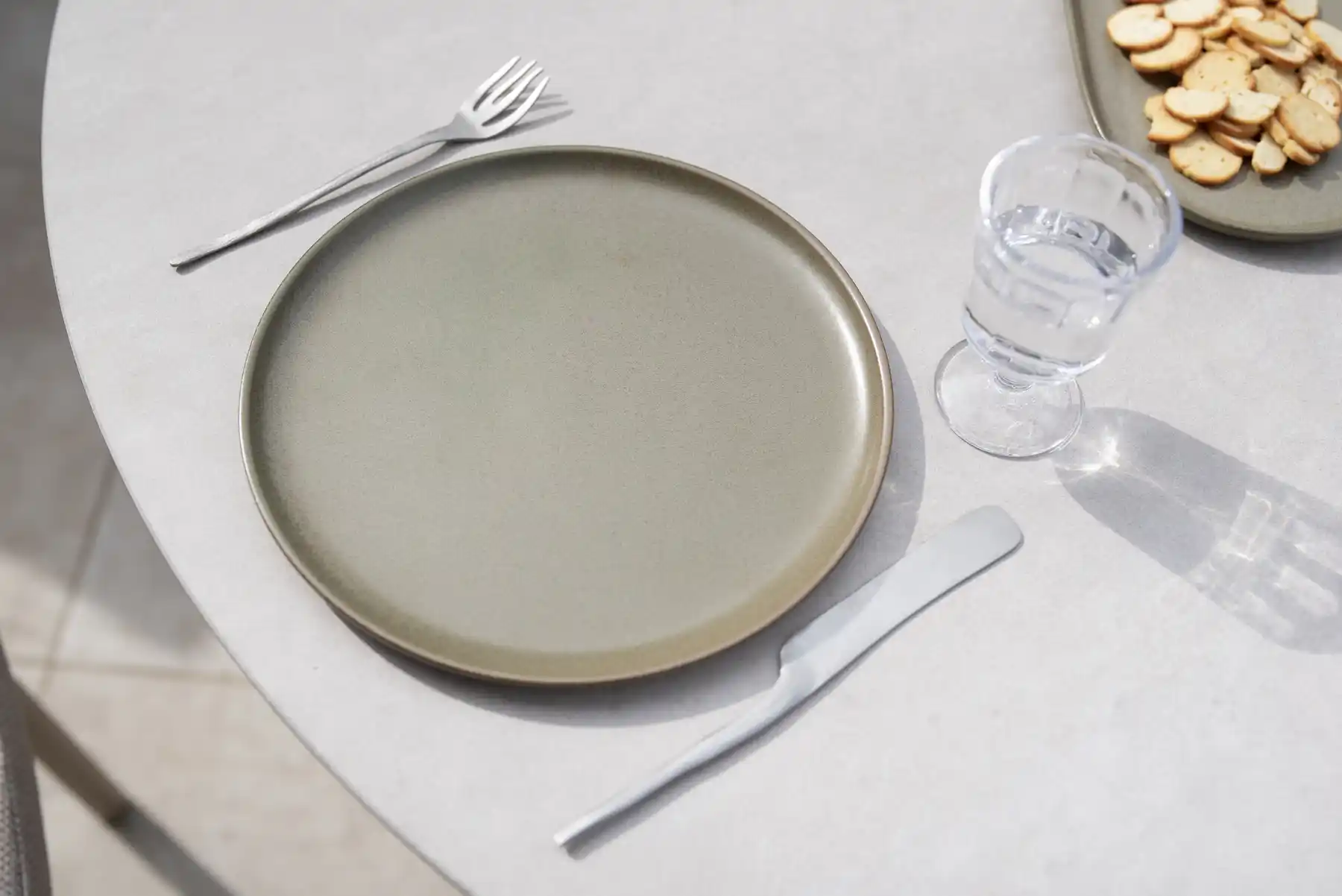Der passende Sarah Low Dining Gartentisch Terre von Taste by 4 Seasons hat ein robustes Aluminiumgestell mit Terre-Pulverbeschichtung und eine runde, sandfarbene Platte mit einem Durchmesser von Ø 130 cm. Der Tisch ist 69 cm hoch. Die Tischplatte aus gehärtetem Glas hat eine Keramikbeschichtung, wodurch sie wie Naturstein aussieht. Außerdem ist die Platte kratzfest, hitzebeständig und leicht zu reinigen.