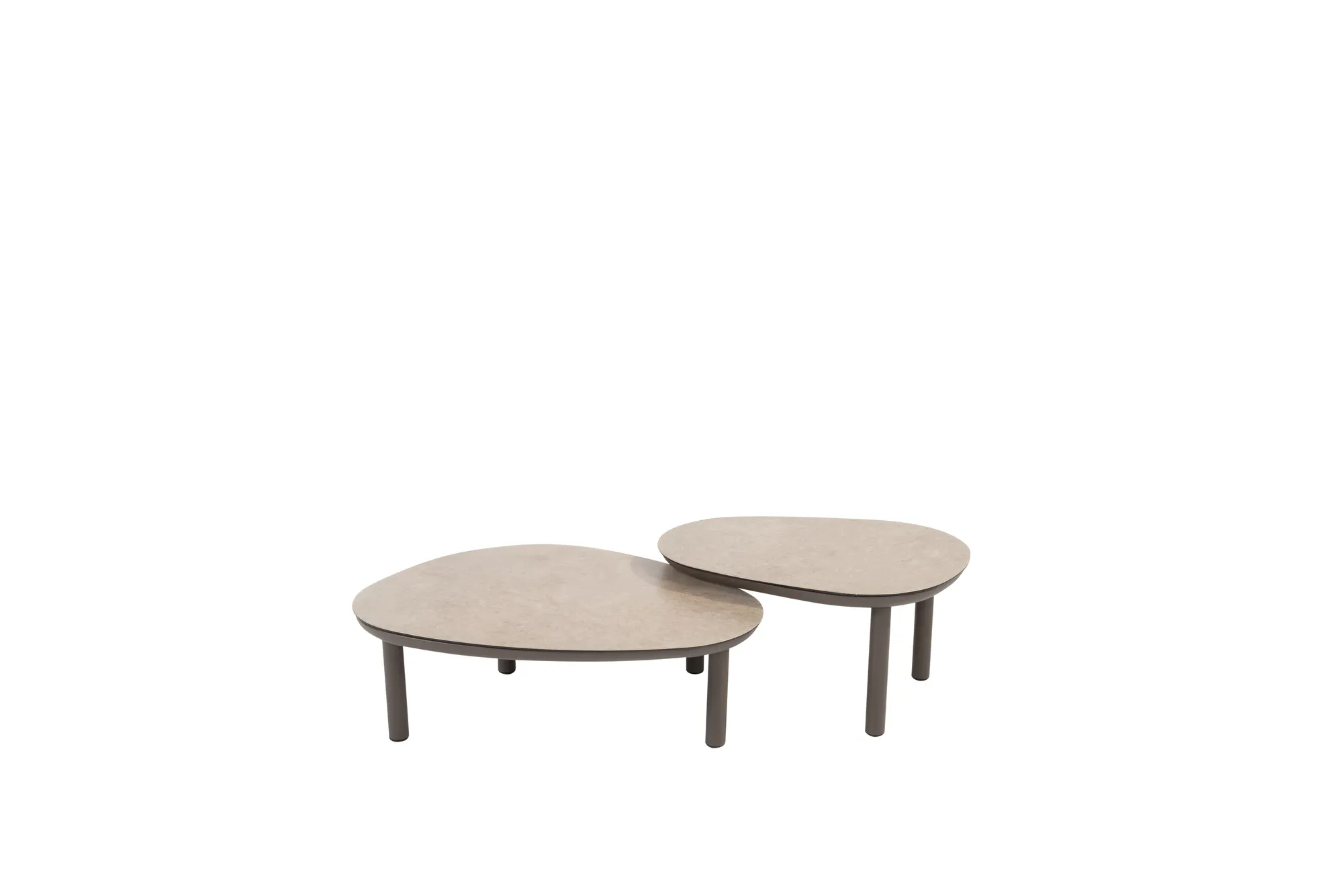 Entdecken Sie dieses Set aus zwei Taste by 4 Seasons Monroe-Loungetischen in Terre-Ausführung. Die Monroe-Loungetische haben Aluminiumgestelle mit einer Terre-Pulverbeschichtung und sandfarbene Tischplatten in verspielten Formen mit den Maßen 65 x 50 und 80 x 60 cm. Die Tische sind 32 bzw. 27 cm hoch. Die bedruckten Keramik-Tischplatten fühlen sich wie Naturstein an, sind kratzfest und farbecht und lassen sich leicht reinigen.