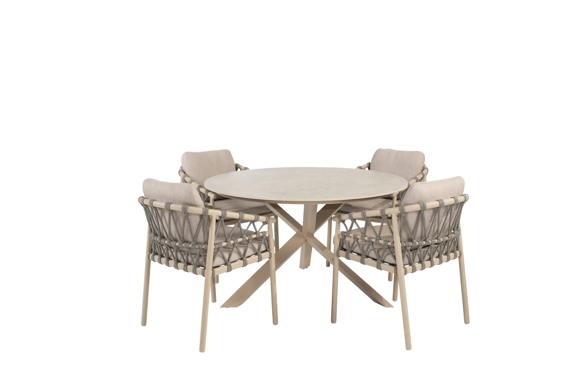 Der passende Prado-Gartentisch von Taste by 4 Seasons hat ein gekreuztes Edelstahlgestell mit einer Lattee-Pulverbeschichtung und eine runde Keramikplatte mit einem Durchmesser von 130 cm. Dieser Tisch ist besonders robust und die raffinierten Details der grauen Keramikplatte verleihen ihm ein besonderes Aussehen.