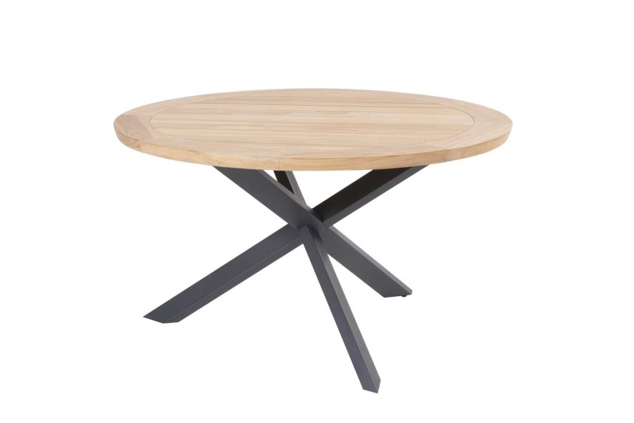 Lernen Sie den Gartentisch „Prado“ von Taste by 4 Seasons kennen. Der stilvolle Tisch verfügt über ein gekreuztes Gestell aus anthrazitfarbenem Edelstahl, auf dem eine runde Tischplatte aus Teakholz mit einem Durchmesser von 130 cm ruht.