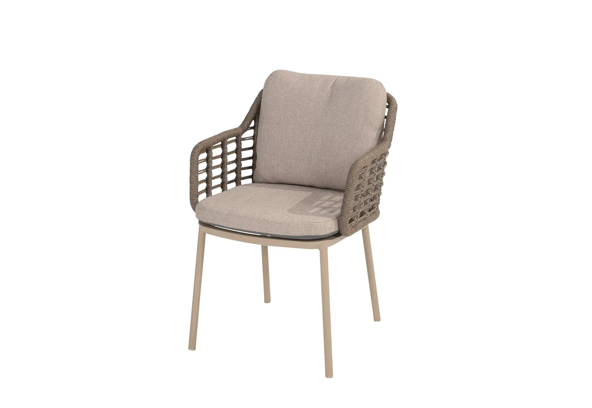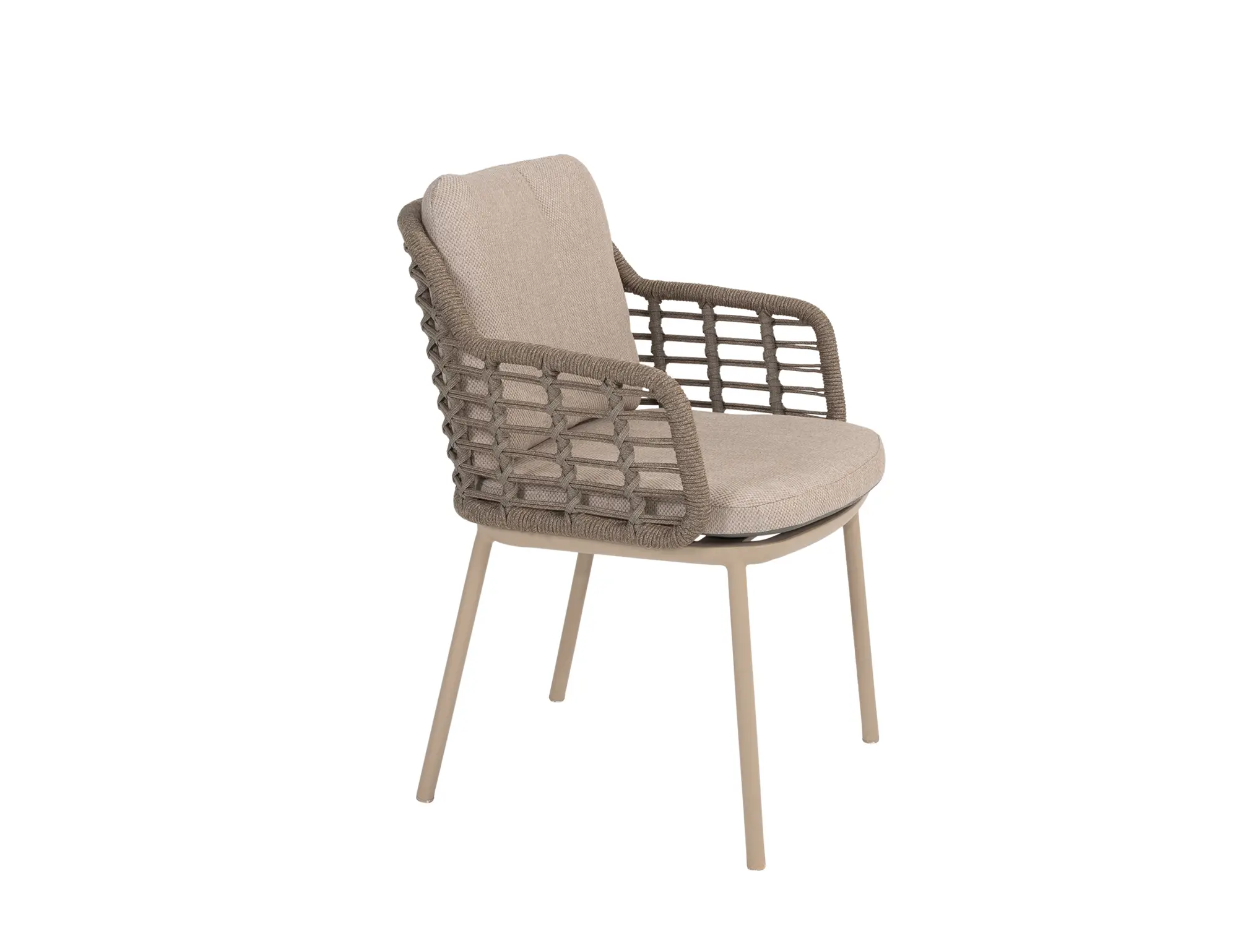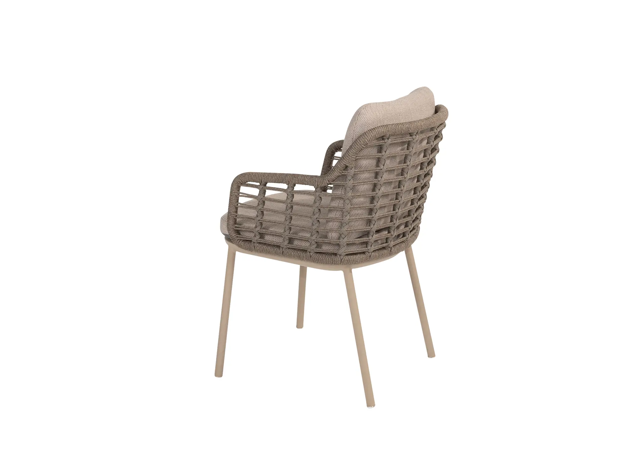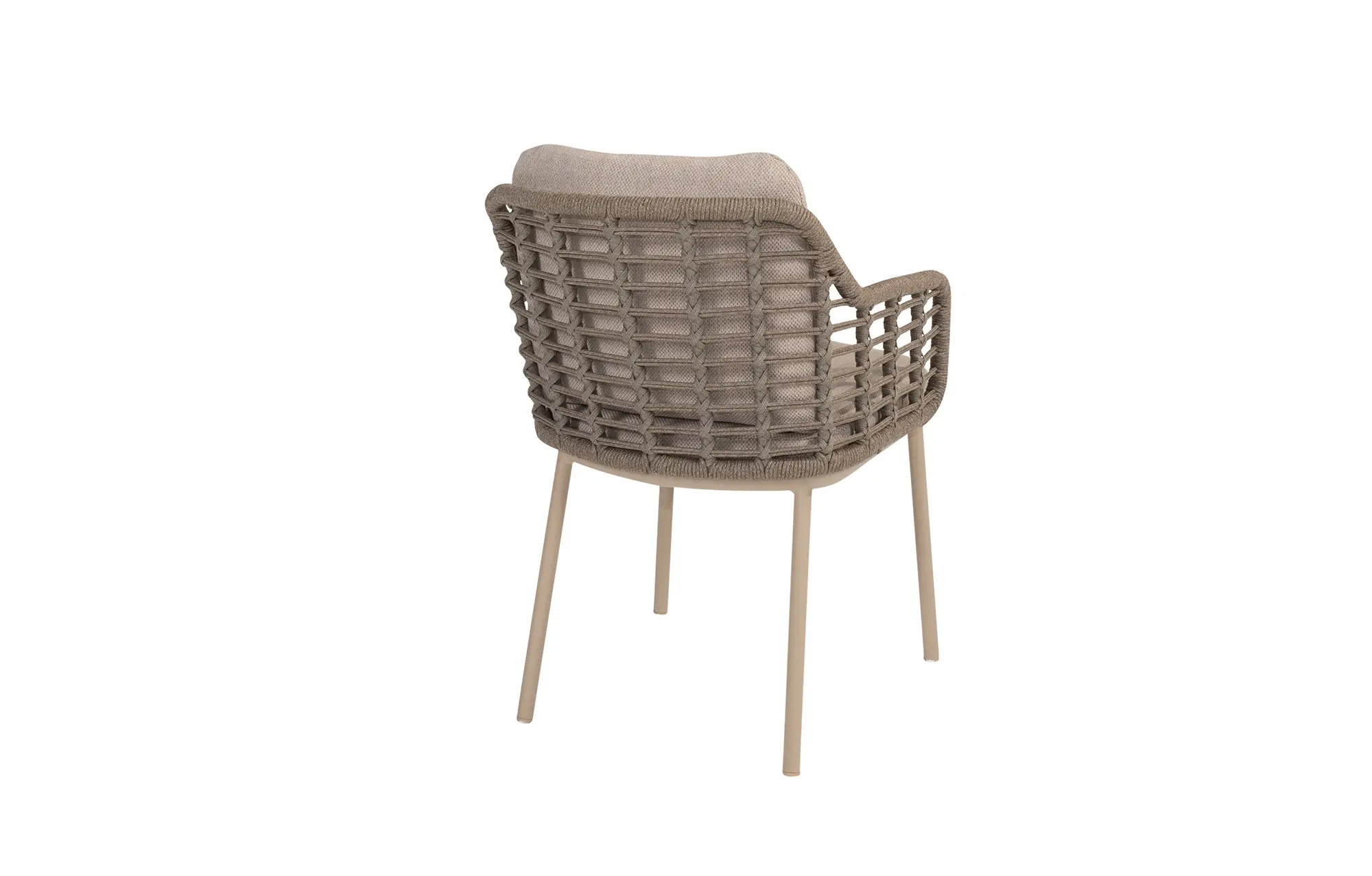 Der Aluminiumrahmen der Puglia-Gartenstühle ist mit einer Latte-Pulverbeschichtung versehen, die nicht nur für ein modernes Aussehen sorgt, sondern auch zusätzlichen Schutz vor Witterungseinflüssen bietet. Die Rahmen werden durch taupefarbene Seilgeflechte ergänzt, die sowohl robust als auch elegant sind.