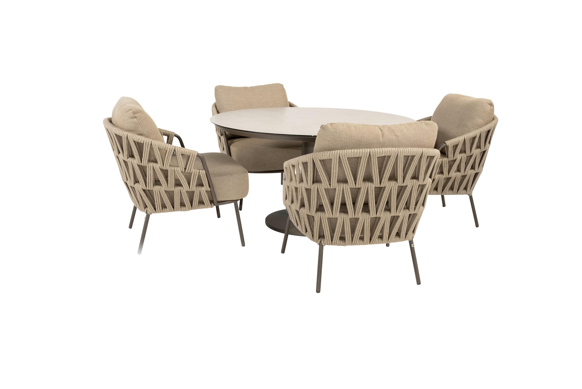 Lernen Sie den Taste by 4 Seasons Sarah Gartentisch in Terre-Ausführung kennen. Der Tisch hat ein robustes Aluminiumgestell mit Terre-Pulverbeschichtung und eine runde Sandfarbene Platte mit einem Durchmesser von Ø 120 cm. Der Tisch ist 75 cm hoch. Die Tischplatte aus gehärtetem Glas hat eine Keramikbeschichtung, wodurch sie wie Naturstein aussieht. Außerdem ist die Platte kratzfest, hitzebeständig und leicht zu reinigen.
