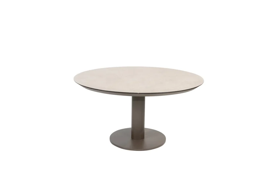 ♦ 1x Sarah low dining Gartentisch | Farbe Terre | Aluminium-Untergestell – Rundem Tischblatt Ø 130 cm aus gehärtetem Glas + Keramikbeschichtung