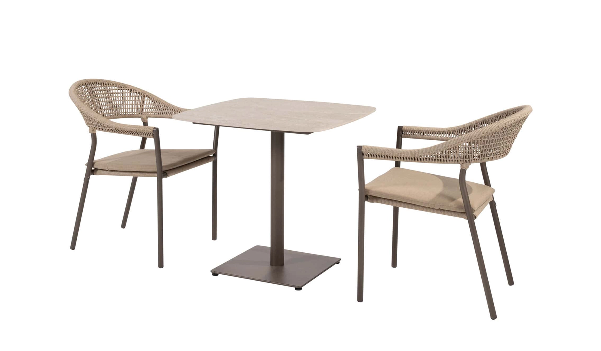 Der Vermont-Gartentisch in der Farbe Terre rundet das Set ab. Dieser Tisch verfügt über ein stabiles Edelstahlgestell und eine strapazierfähige Keramikplatte von 75 x 75 cm. Mit einer Höhe von 72 cm hat der Tisch eine bequeme Sitz- und Esshöhe – perfekt für eine gemütliche Terrasse oder einen Balkon.
