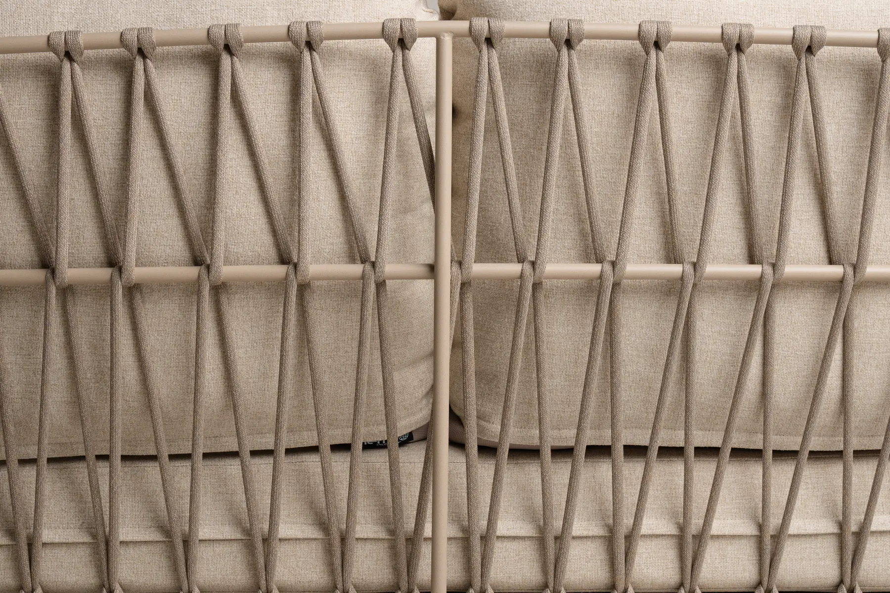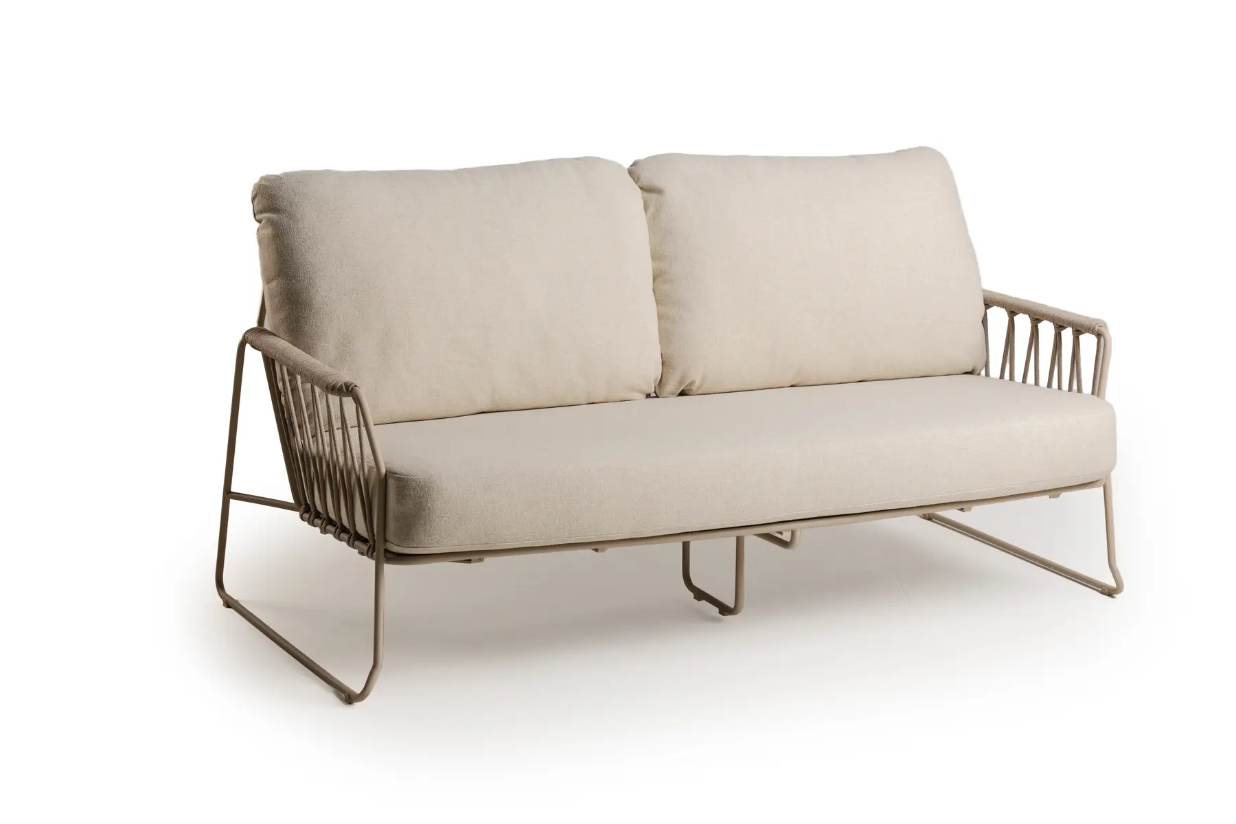 Die Tierra Outdoor Rivera Lounge-Couch in Champagnerfarbe hat ein elegantes und harmonisches Design. Die Couch ist bis ins Detail mit geflochtenem Seil verarbeitet. Die Kombination aus dem schlanken Aluminiumrahmen und dem hochwertigen Seil sorgt für ein luftiges und modernes Gesamtbild, während die dicken Kissen einen hohen Sitzkomfort bieten.
